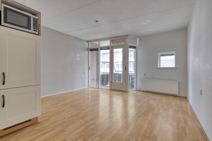 Het appartement is gelegen op de tweede verdieping en heeft een lichte woonkamer met open keuken en toegang tot het heerlijk zonnige balkon op het zuidoosten. Er is één ruime slaapkamer aanwezig en een nette badkamer.